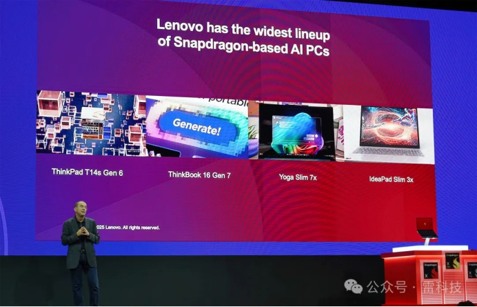 除此之外,联想执行副总裁、IDG 智能设备业务集团总裁 Luca Rossi 还宣布了面向商务人士和 IT 领导者,推出搭载骁龙 X Elite 的第六代 ThinkPad T14s 和第七代 ThinkBook 16,专为原生 AI 工作场所打造。而面向创作者和创新者,联想也推出了同样搭载骁龙 X Elite 的 Yoga Slim 7x。